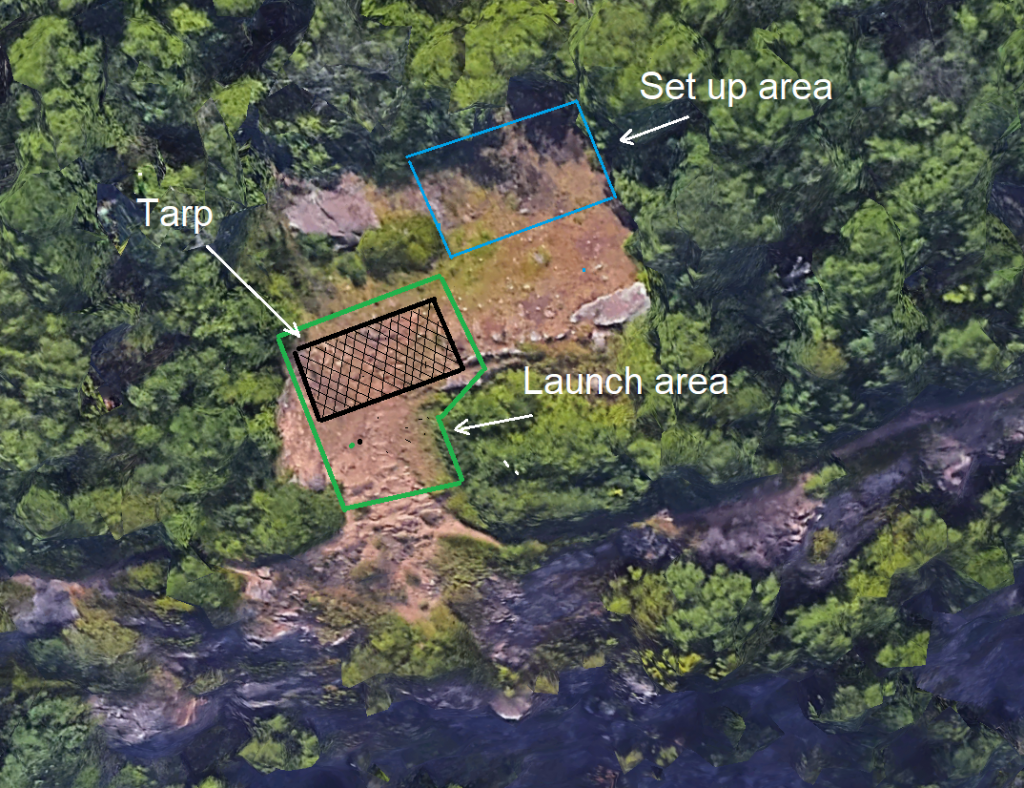 - There are several very good approaches to landing at the LZ, as can be seen in the image below. It is best practice to arrive high and fly to the west of the LZ and do either a standard pattern to land or a classic figure 8 descent keeping away from the power lines on the east end of the LZ, highlighted below in red. The large bushes located just below ‘LZ’ in the image have now been cut down which increased the usable area and allows an easier approach to the South.