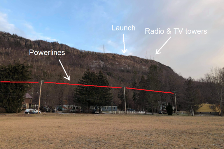 - Hazards: Steep rock cliff, TV/Microwave towers to the South of launch, other misc. towers to the North on the ridge, power lines in the landing area (as shown in the image above).